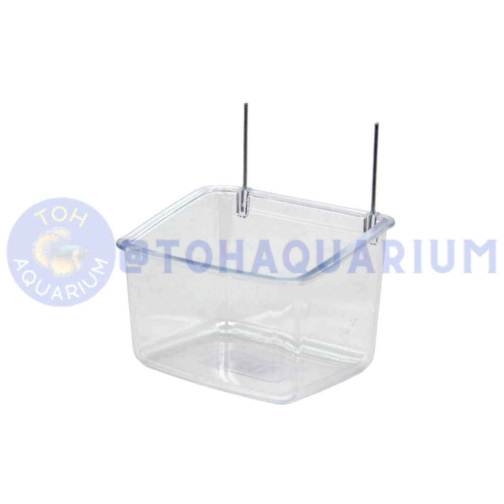 Transparent synthetic gallypot. The hooks make it easy to place it in the bird cage.