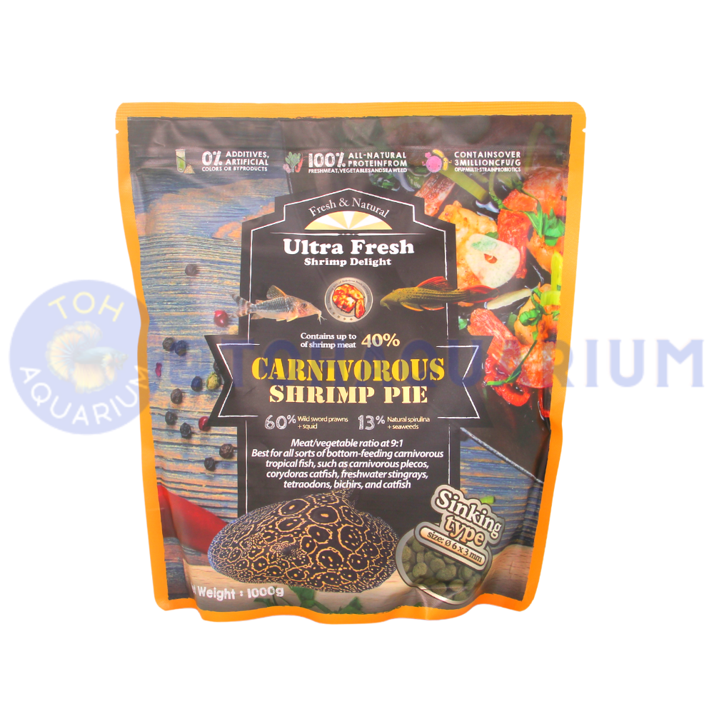 Formulated with high content of wild sword prawns (up to 40%), fresh squid, natural spirulina, fresh-pick garlic, plus a blend of carefully selected natural ingredients, this formulation delivers high palatability and nutritional values for all kinds of bottom-feeding carnivorous tropical fish, such as carnivorous plecos, corydoras catfish, freshwater stingrays, tetraodons, bichirs, and catfish.