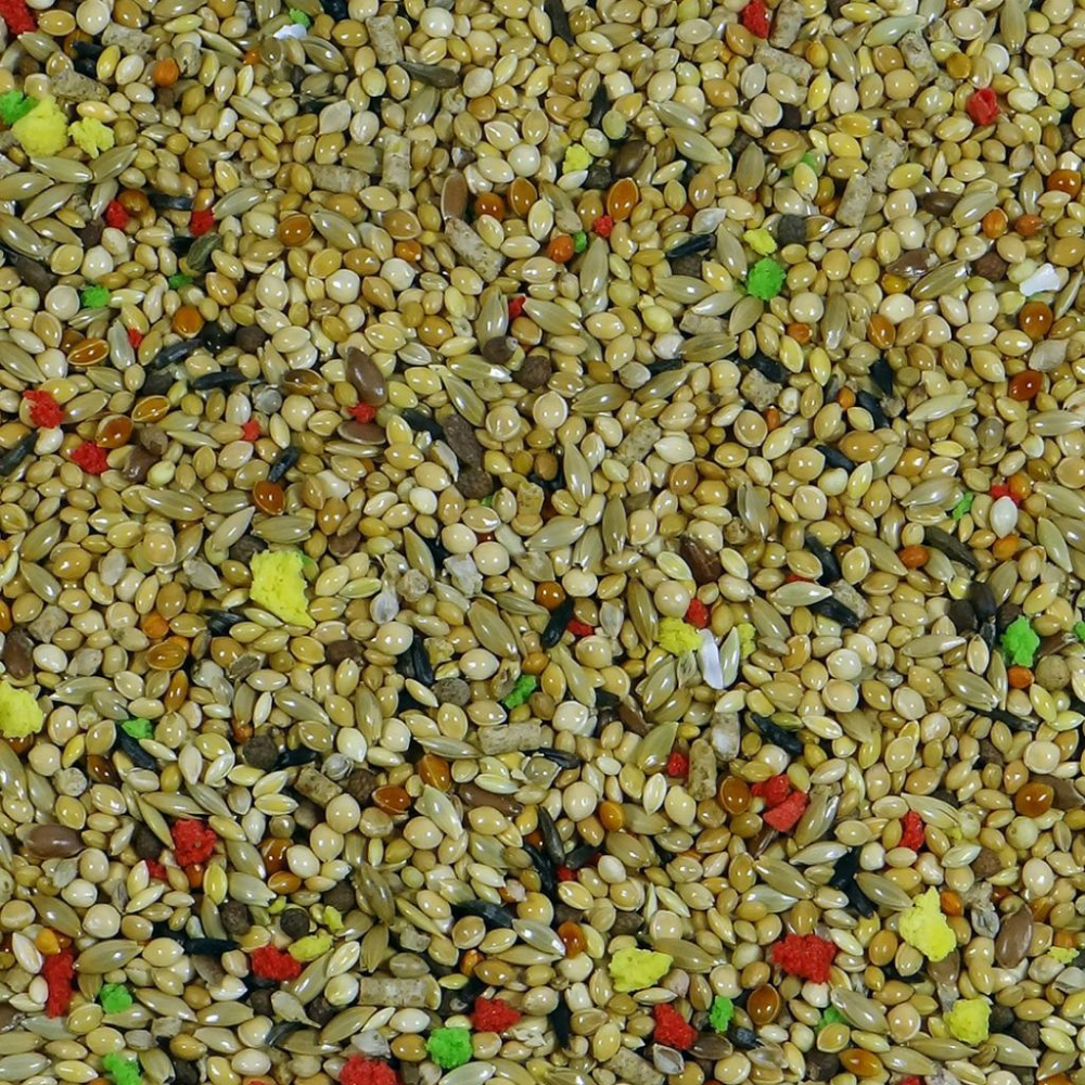 Seeds 93.50% (millet la plata, yellow panicum, white millet, canary seed, red millet, niger seed, red panicum, perilla seed, flax seed), vegetable (by-)products, minerals (oyster shell 1.5%), bakery products, oils and fats, yeast