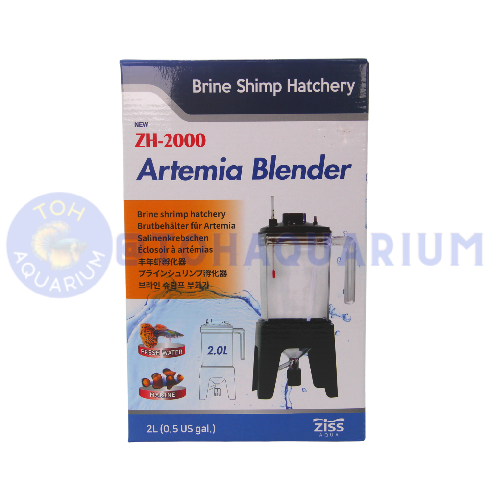 The Ziss Aqua ZH-2000 Artemia blender is the perfect artemia cultivation set for aquarium holders and growers! With its unique design, the ZH-2000 Artemia blender makes cultivating artemia eggs very easy and ensures a high hatching percentage. The grow kit consists of a large plastic (2 liter capacity) container with handle, sturdy plastic base, thermometer with O-ring, Ziss Aqua air stone and tube for the inside of the container, lid, unique valve to let the Artemia out of the container without any hassle and a pipette with which the Artemia can be fed.