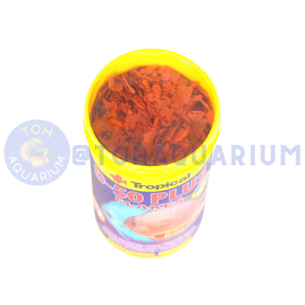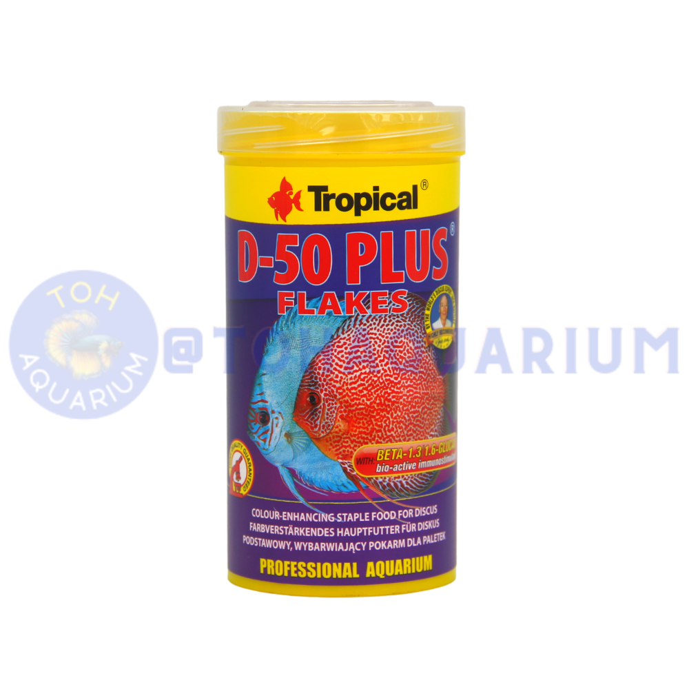 D-50 PLUS colour-enhancing flakes for discus. Colour-enhancing flake food with high (50%) protein content, intended for everyday feeding of discus and other fish with high nutritional needs. Its exceptional nutritional value makes D-50 PLUS a perfect feeding solution for spawning pairs and young fish. Squid (8%) and krill (3%) make the food very palatable and provide the source of easily digestible protein, rich in essential amino acids. High content of natural astaxanthin guarantees bright and vivid coloration. The improvement of coloration can be compared to the effects reached with ASTACOLOR. The resistance to diseases is increased by a natural immune stimulator – beta-glucan. Fish are lively, energetic and ready to spawn, when regularly fed with D-50 PLUS.