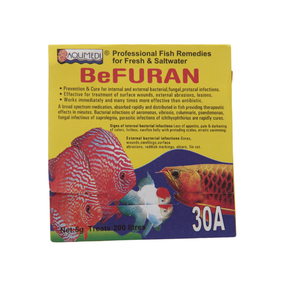 AQUMEDI BeFuran A board spectrum medication, prevention and cure for internal and external bacterial, fungal, protozoa infections, effective for treatment of surface wounds, external abrasions and lesions.
