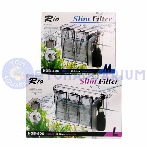 RIO Slim Filter HOB-400 380L / Hr suitable for 35-50cm tank slim design silent and cool operation carbonised filter cartridge low energy consumption (5.5w) size: 19 x 5 x 15.5cm
