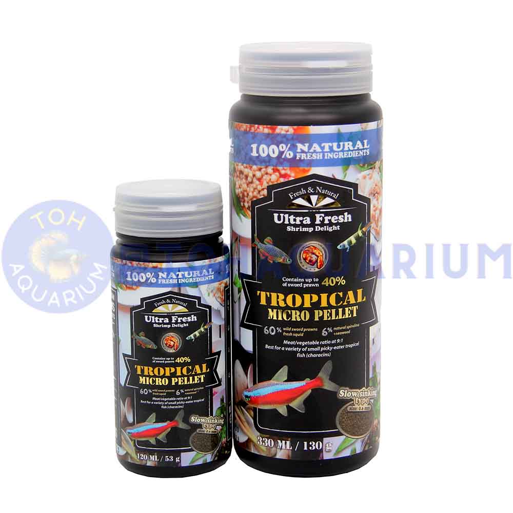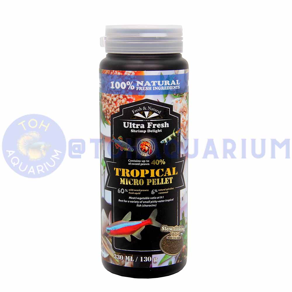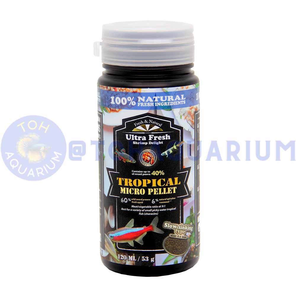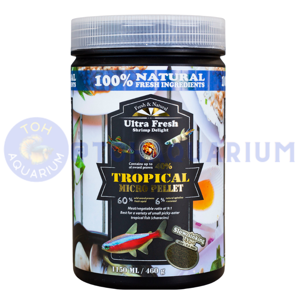 Formulated with high content of wild sword prawns (up to 40%), fresh squid, natural spirulina, fresh-pick garlic, plus a blend of carefully selected natural ingredients, this formulation delivers high palatability and nutritional value for a variety of small picky-eater tropical fish (characins).